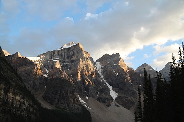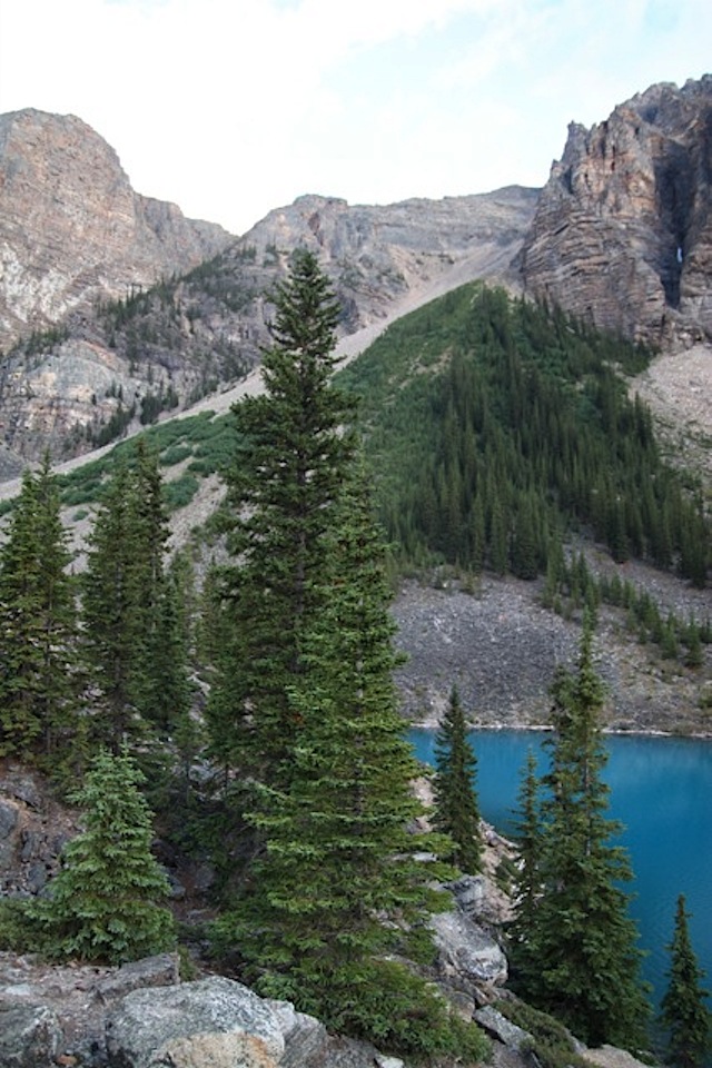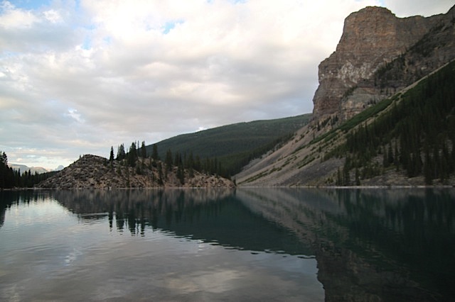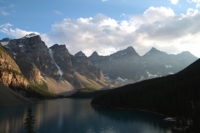 En fait, dès qu’on parle du lac Louise, la plupart des gens disent « va plutôt au lac Moraine, c’est plus beau, et moins touristique ». Les deux affirmations sont vraies, en effet. Du monde, il y en a moins ; mais on est quand même un dimanche après midi du mois d’août, donc moins, c’est encore beaucoup. Le lac n’est pas nécessairement plus beau ; j’irais même préféré l’eau du lac Louise pour la couleur. Par contre, Moraine présente l’avantage de ne pas avoir le gros hôtel laid à un bout ; et puis les montagnes qui l’entourent sont également plus impressionnantes. On voit quelques pics de ce qui s’appelle « la vallée des 10 pics ». Ça donnerait envie de découvrir les autres. Malheureusement, il est déjà tard, on est déjà pas mal fatigué, donc on se contentera d’aller jeter un oeil à l’autre bout du lac.