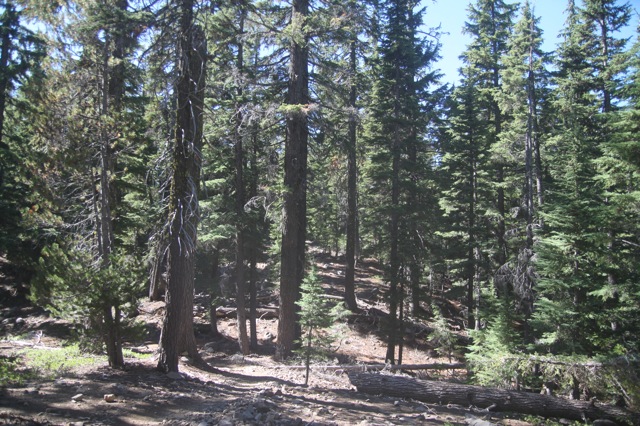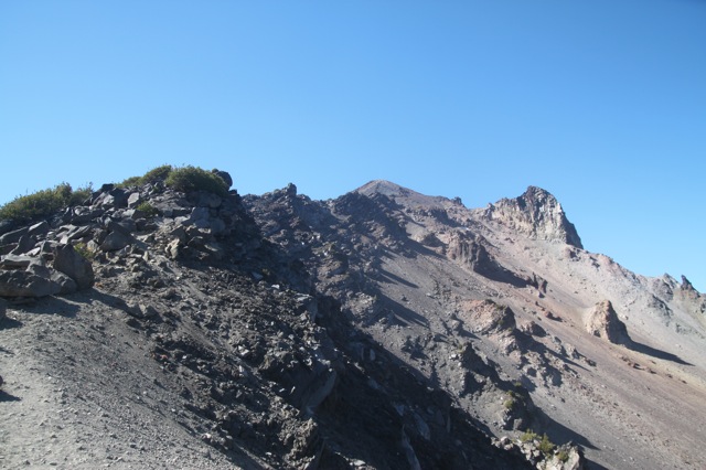 Alors que je monte, je vois apparaître au loin une véritable merveille. Au sud, malheureusement, et déjà enneigée. Mais qu’elle est belle, et qu’est-ce qu’elle me fait envie ! Elle aussi domine allègrement le monde autour. J’apprendrais grâce à un randonneur croisé en chemin que son petit nom c’est Shasta. 14 162 pieds. Un vrai de vrai à 4000 celui là. 4316 pour être exact. Enfin… il est déjà trop tard pour cette année. Dommage. Peut être lors d’une prochaine visite ?