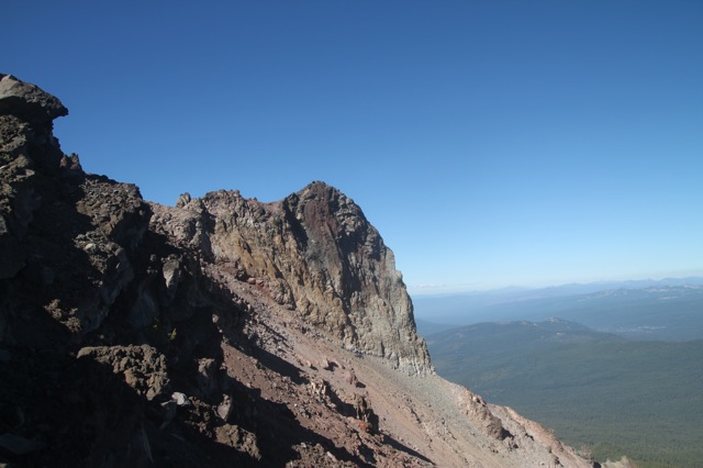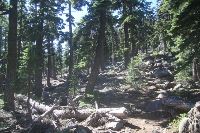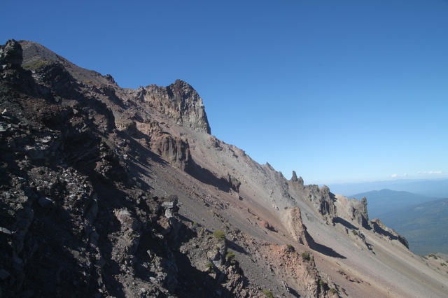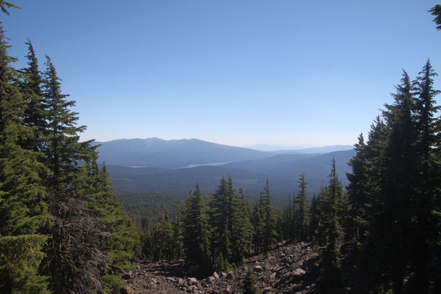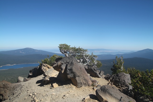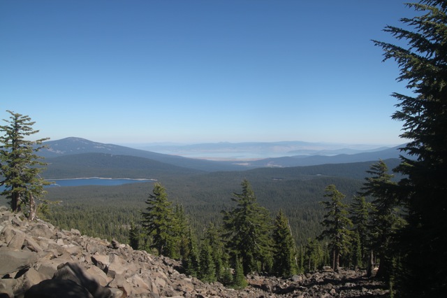 Alors, si on résume : tout à gauche, en gros, c’est l’est. Le premier lac que l’on peut voir, c’est « Four miles Lake ». Il semblerait qu’il y ait un terrain de camping par là bas. Ça pourrait être une belle destination d’après descente. Ensuite, c’est le chemin par où je suis arrivé. Et par où je vais repartir également. Le lac que l’on voit tout au fond, dans l’axe du sommet, c’est « Klammath Lake ». Si vous vous souvenez, c’est par là que je suis passé en me rendant à Burning Man. Il y a plusieurs semaines déjà ! D’ailleurs, il me semble que je l’avais repéré, ce petit sommet triangulaire, alors que je passais dans le coin. L’autre lac que l’on voit après, c’est « Lake of the Woods », je crois. Je suis pas sûr de son nom, pis de toutes façons, je pense pas aller le voir. Quoi que… il y a dans le coin de magnifiques coulées magmatiques semblent ils… le lac suivant, c’est « Willow Lake » ; celui là même où j’ai dormi cette nuit même. Ensuite, c’est le prolongement de la crête, et dans l’axe (plein nord) un lac que je ne connais pas, et que je ne sais pas d’où il sort. À la même hauteur que le lac, mais un peu plus à droite, il y a ce qui ressemble à une coupe de bois, avec deux « L » imbriqués. En haut et un peu à gauche de ça, un nuage un peu bizarre. En fait, ça semble être un nuage de fumée, comme s’il avait un gros incendie. Et sauf erreur, c’est pas mal par là bas « Crater Lake ».