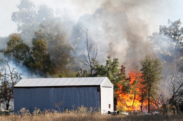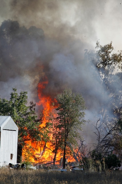 Au programme, aujourd’hui, c’est « autoroute ». Mais de temps en temps, pour le plaisir et se changer les idées, je quitte un peu la route principale, pour voir de quoi ça à l’air « à côté ». C’est pas très différent en fait, mais bon… sauf que la fois où on voit une grosse fumée noire à l’horizon, je me dis que ça peut être intéressant. Quelques petites routes plus loin, on se joint à un petit attroupement, admirant nous aussi les pompiers en train d’éteindre la maison qui brûle. Rien de bien artistique, mais bon…