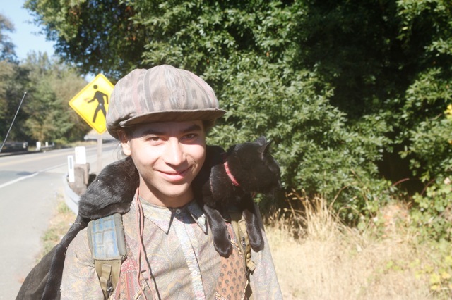 On s’arrête un tout petit peu après pour prendre le petit déjeuner. Mowgly hésite sur la suite de son itinéraire. À priori, j’ai prévu de mon côté d’être à Arcata en fin de journée, et il sait depuis San Francisco qu’il peut rester avec moi jusque là. Et puis finalement, il se décide. À la place, il va rejoindre la côte. On a passé il y a un ou deux kilomètres la route qui rejoignait Fort Bragg. Je fais donc demi tour, pour le déposer au début du chemin. Retrouver ma tranquillité et ma solitude me fait du bien ; et puis ça aide de savoir que je peux le revoir bientôt. Peut être. Après tout, comme je lui dis, il reste prêt de trois semaines d’ici à Halloween, alors je pourrais éventuellement m’inventer de nombreux autres plans d’ici là. Maintenant, au moins, je sais que je n’oublierais plus de prendre des photos !