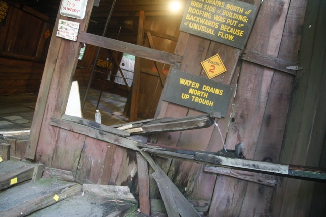 Un tout petit peu après, une autre chose qui m’avait grandement intrigué la première fois « la colline de la confusion ». Aucune idée de ce que c’est, mais ça m’intrigue. J’ai tout mon temps, je m’arrête donc pour jeter un oeil. Une petite boutique de souvenirs, trois mini constructions, un totem. Je ne comprends pas vraiment… et puis il y a un article de journal, qui explique qu’ici, la gravité semble être différente, et que l’on ne sait pas pourquoi. Une série de questions réponses, également. Est-ce un canular ? « c’est à vous de décider ». Bref, pour seulement 5 $, je décide de me faire arnaquer. La madame à l’accueil me dit qu’il y a 10 expositions, et que pour certaines d’entre elles, c’est mieux d’être deux. Je lui dis que c’est pas grave, je me débrouillerais tout seul.