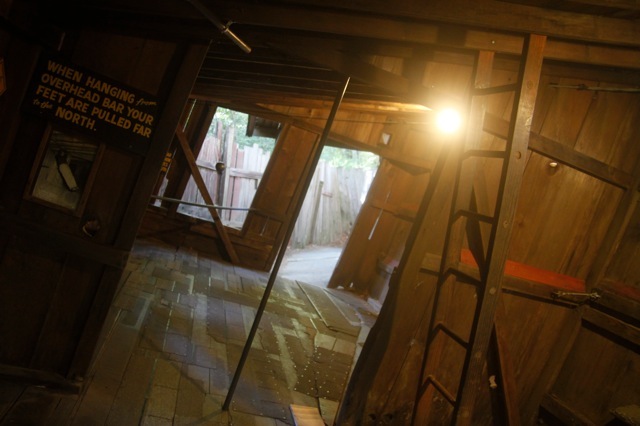 Pas facile d’expliquer exactement de quoi il en retourne. En gros, vous avez une maison complètement tortue dans tout les sens, et on vous fait faire des expériences pour vous convaincre que la gravité se comporte étrangement dans le coin. Je regarde, j’observe, je contemple, et je ressens. En effet, l’eau semble couler vers le haut. Tout comme la balle de golf, qui remonte la pente. Et quand je m’accroche à la barre, j’ai très clairement l’impression que mes jambes ne tombent pas à la verticale. Et puis marcher là dedans, on passe son temps à rechercher son équilibre, parce qu’il y a quelque chose qui ne marche pas. Bon, évidemment, mon cerveau rationnel sait que tout est question de trompe l’oeil et de point de vue. Je pends verticalement à la barre, mais tout étant tordu autour de moi, j’ai vraiment l’impression de ne pas aller dans la bonne direction. Il n’y a pas d’énorme météorite qui se soit écraser dans le coin, perturbant le champ de gravité terrestre. Il n’empêche que, en effet, évoluer dans cet endroit est très confondant et désorientant et que je m’amuse bien pendant le quart d’heure que je passerais là dedans.